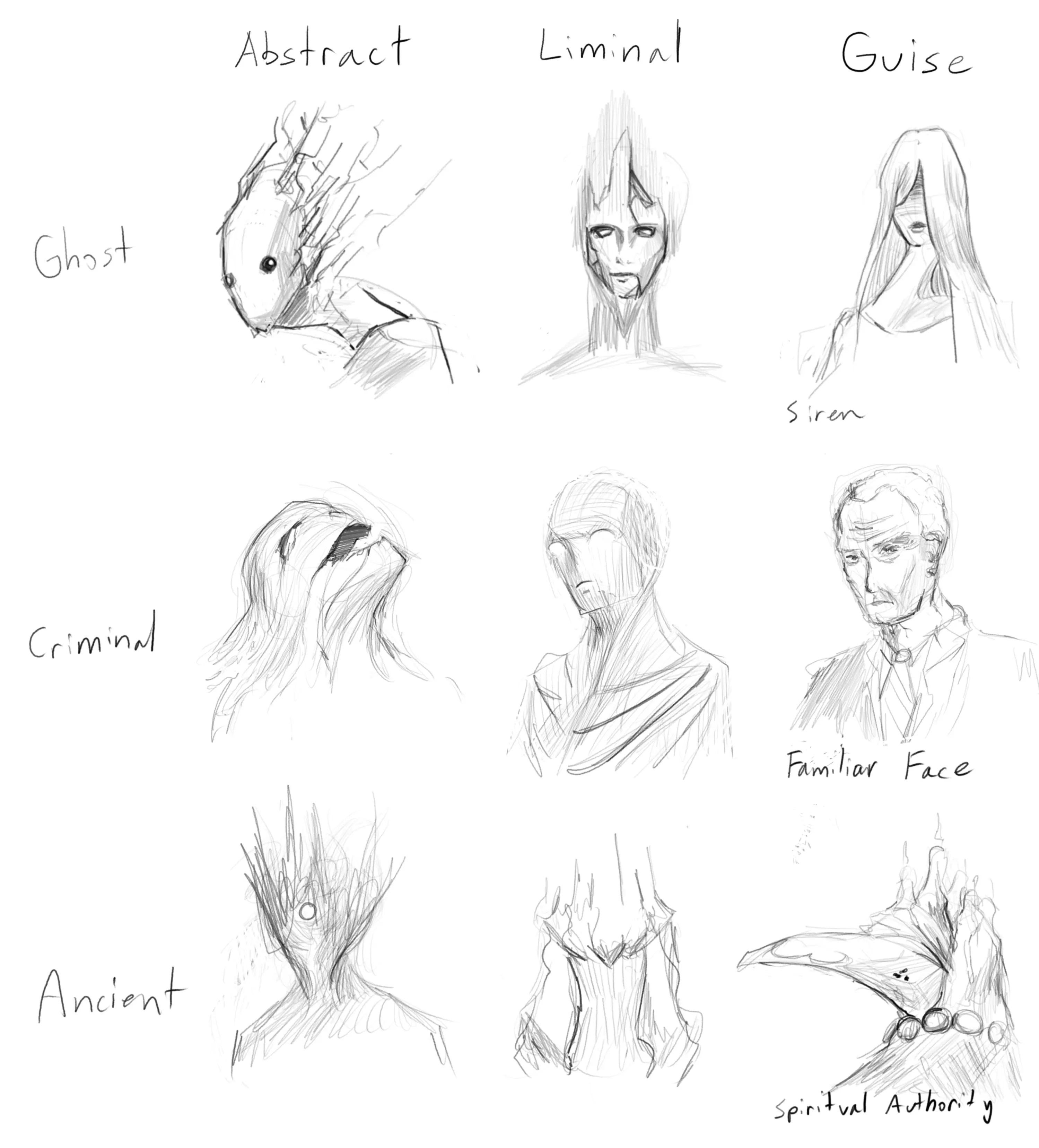 Right away, we assembled reference images of how we imagined the tone and style of the world and characters. Everyone in the team had some background in visual art, so at this early stage everyone wanted a say in the visual language. When I was put on as lead artist, my first task was to identify and consolidate recurring elements and design styles into a cohesive, distinct visual language. They key features I pinned down were heavy, dominating silhouettes, clear colour coding and a limited palette. Furthermore, since I was adapting this to a game, I decided to give Hell a more organic, rougher feel that suited more variety beyond arbitrarily separated rocky wastelands.
